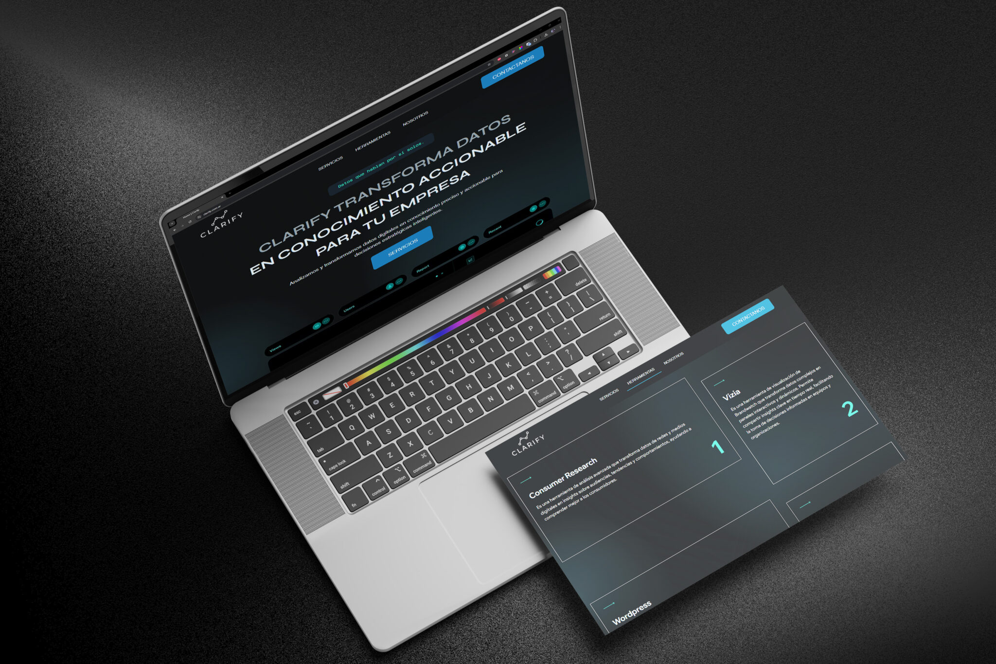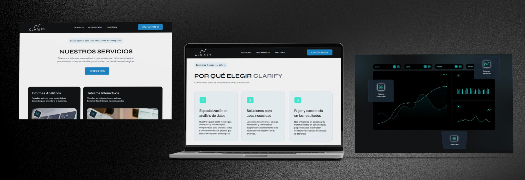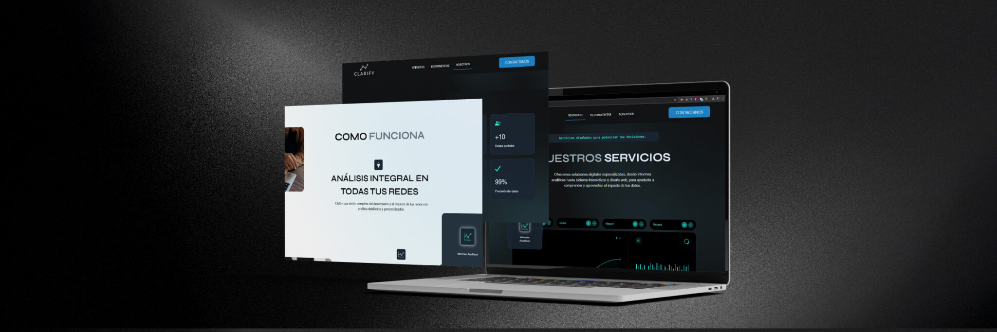 Además, diseñamos y desarrollamos su sitio web institucional, asegurando una experiencia de usuario intuitiva y accesible. La estructura del sitio facilita la navegación, permitiendo a los visitantes comprender rápidamente los servicios que ofrece Clarify y su propuesta de valor en el análisis de datos de redes sociales. El diseño visual es coherente con la identidad de la marca, utilizando una paleta de colores y tipografía que refuerzan la imagen de innovación y profesionalismo.